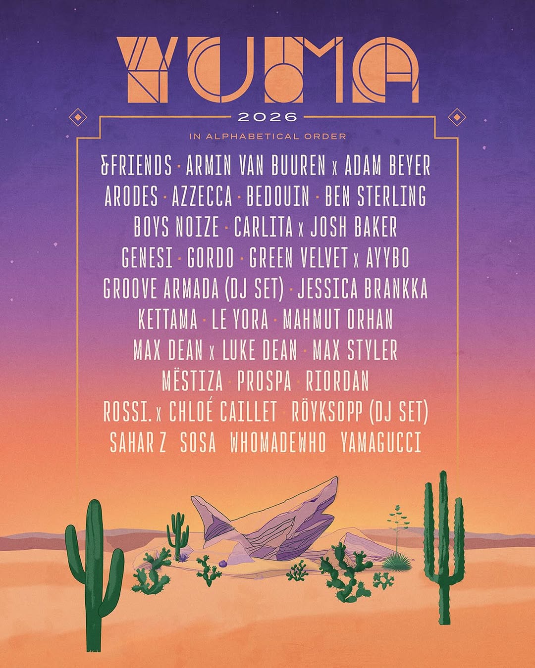 Uno de los festivales más importantes del mundo esta de vuelta, Coachella Valley Music and Arts Festival 2026 con su sede en «Indio, California» (USA). Las mejores bandas, grupos, artistas, DJs y productores alrededor del mundo realizaran sus mejores actos del 10 al 12 (primer fin de semana) y del 17 al 19 (segundo fin de semana) de abril de 2026. Dicho festival anunció el talento que se presentará en el escenario Yuma, famoso escenario por recrear la atmósfera de un club nocturno de primer nivel. Uno de los escenario más famosos en el mundo de la música electrónica en donde llegarán los mejores DJ y productores de la escena. A continuación podemos ver los nombres de esos artistas y más información acerca de este grandioso festival: